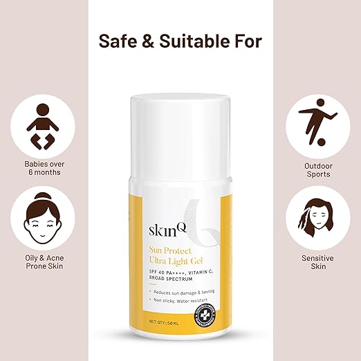 • SUITABLE FOR INDIAN SKIN TYPES: This sunscreen is formulated specifically for Indian skin tones and does not leave a white cast. It gets easily absorbed into the skin and does not leave any residue. The SkinQ Sun Protect Gel is suitable for women , men and Children