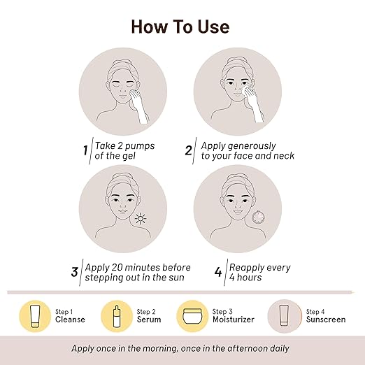 • USAGE: Apply 3 -4 pumps of this sunscreen on your face and neck, Wait for at least 20 minutes before sun exposure​. Reapply every 2-3 hours for best results